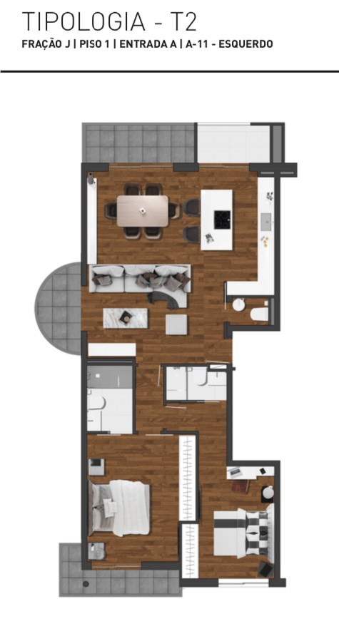 1 - Planta geral; 2 - Vista 3D da planta; 3 - Perspetiva geral do empreendimento