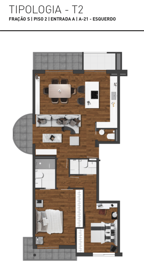 1 - Planta geral; 2 - Vista 3D da planta; 3 - Perspetiva geral do empreendimento