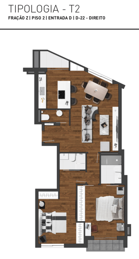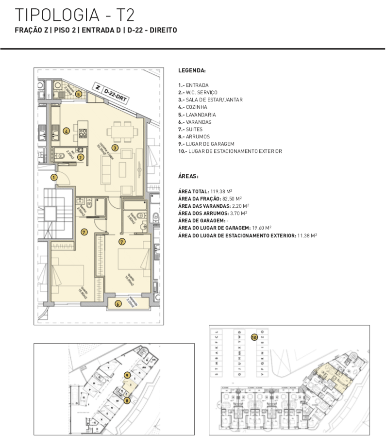 1 - Planta geral; 2 - Vista 3D da planta; 3 - Perspetiva geral do empreendimento